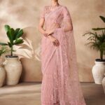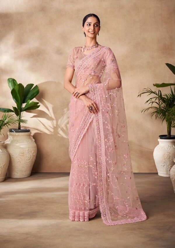 Peach Sequin Thread Embroidered Net Saree Set – XSR23402